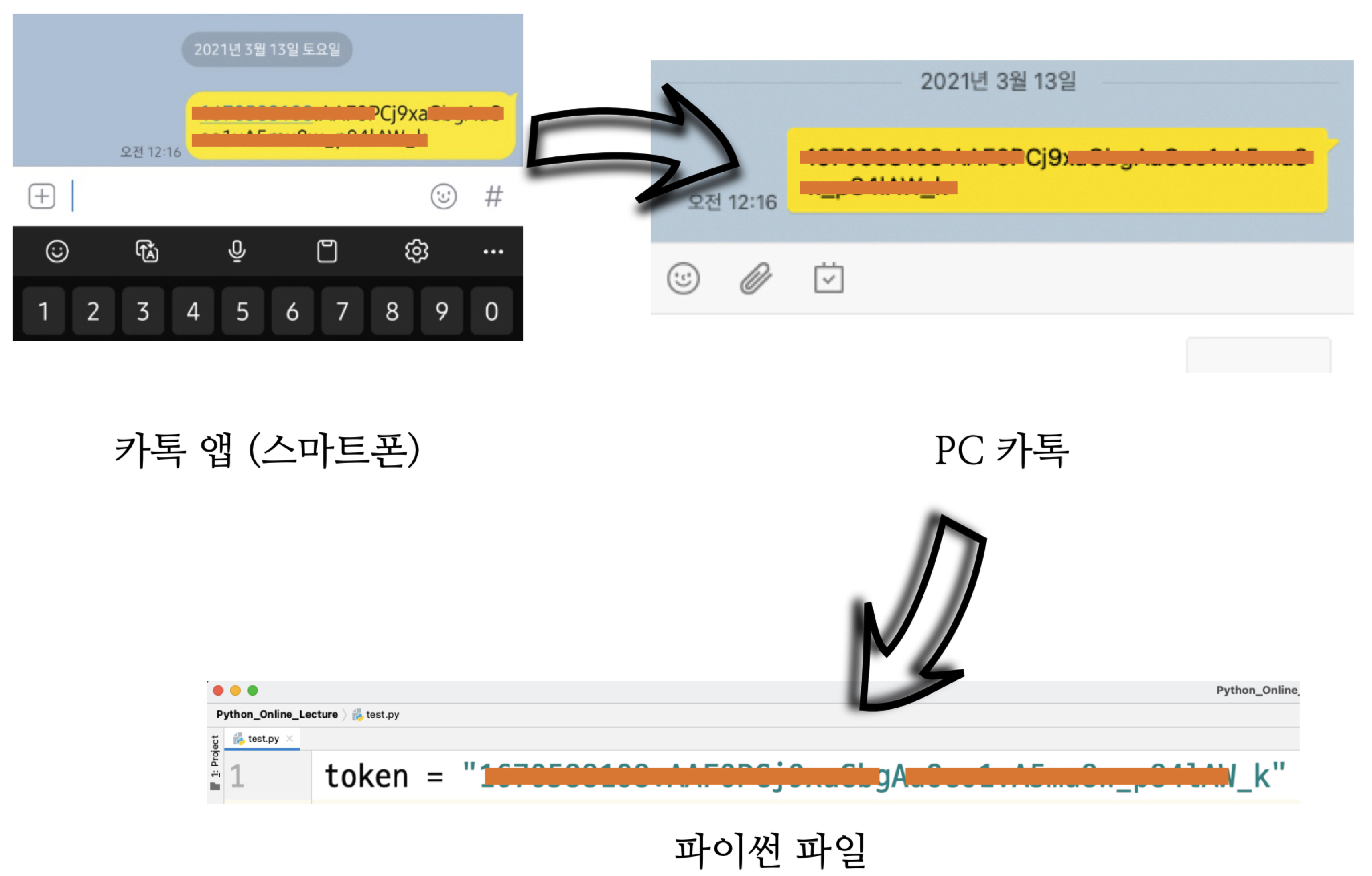 저는 이 복사한 토큰을 스마트폰 카톡에 보내고,