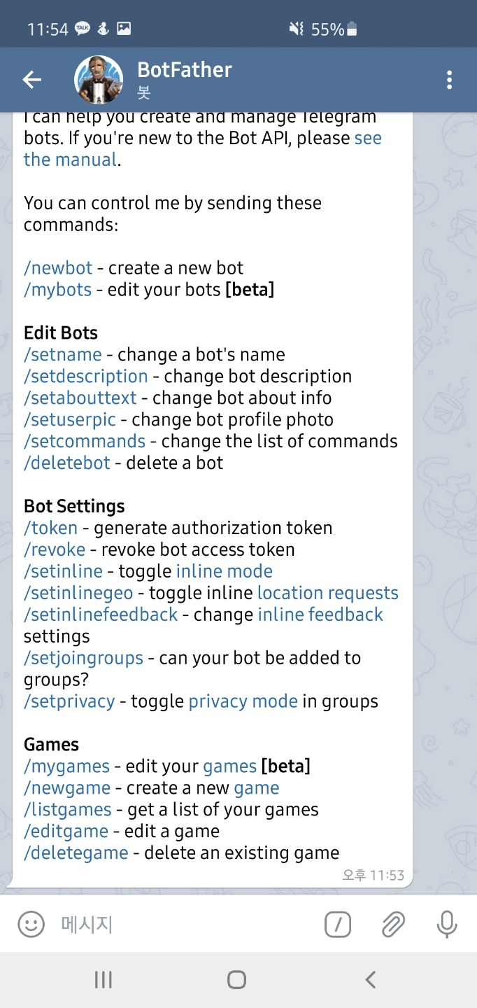 우리는 여기서 /newbot 이라고 입력해줍니다.