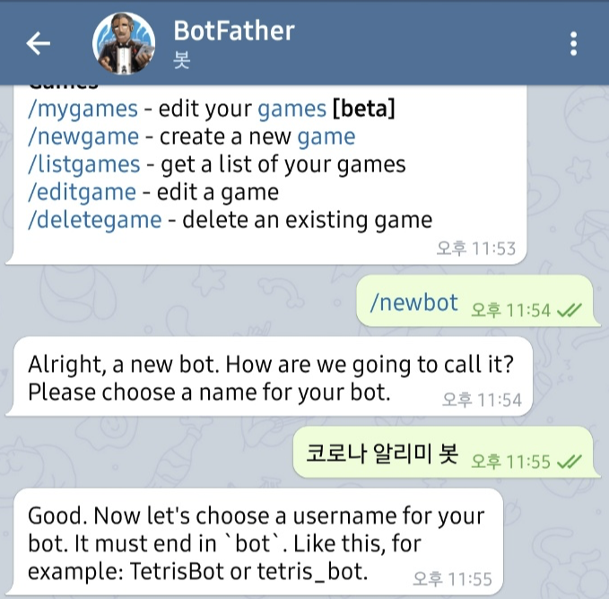 그럼 아래와 같이 새로 만들 봇을 위한 이름을 정하라고 합니다.