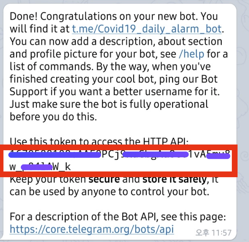 저의 경우 'Covid19_daily_alarm_bot' 이라고 지었는데