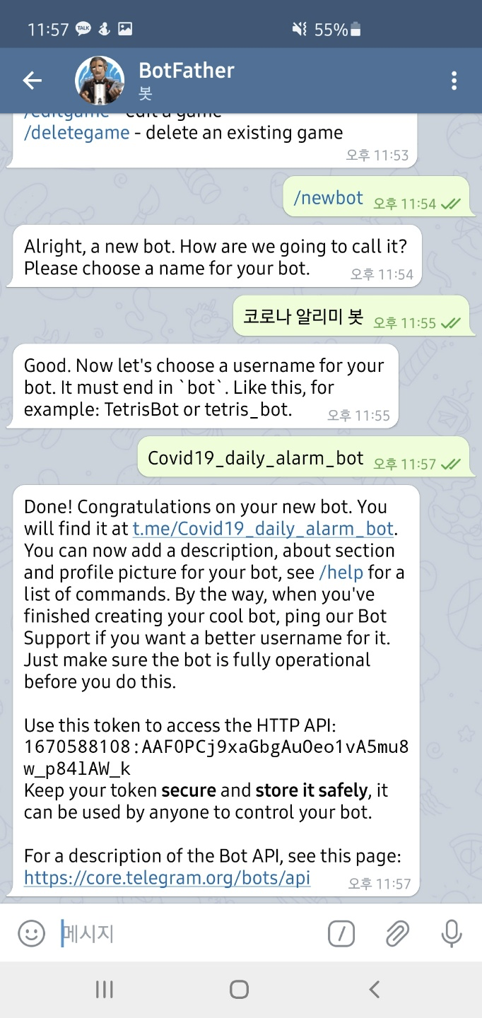 저의 경우 'Covid19_daily_alarm_bot' 이라고 지었는데