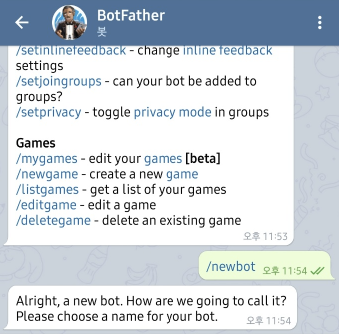 그럼 아래와 같이 새로 만들 봇을 위한 이름을 정하라고 합니다.